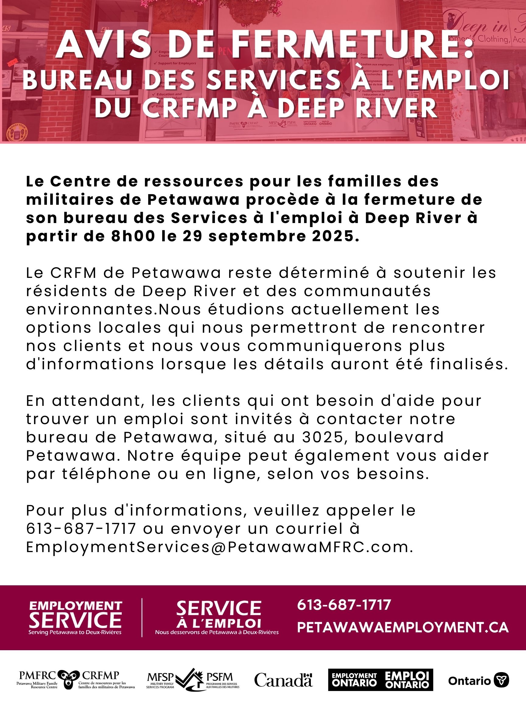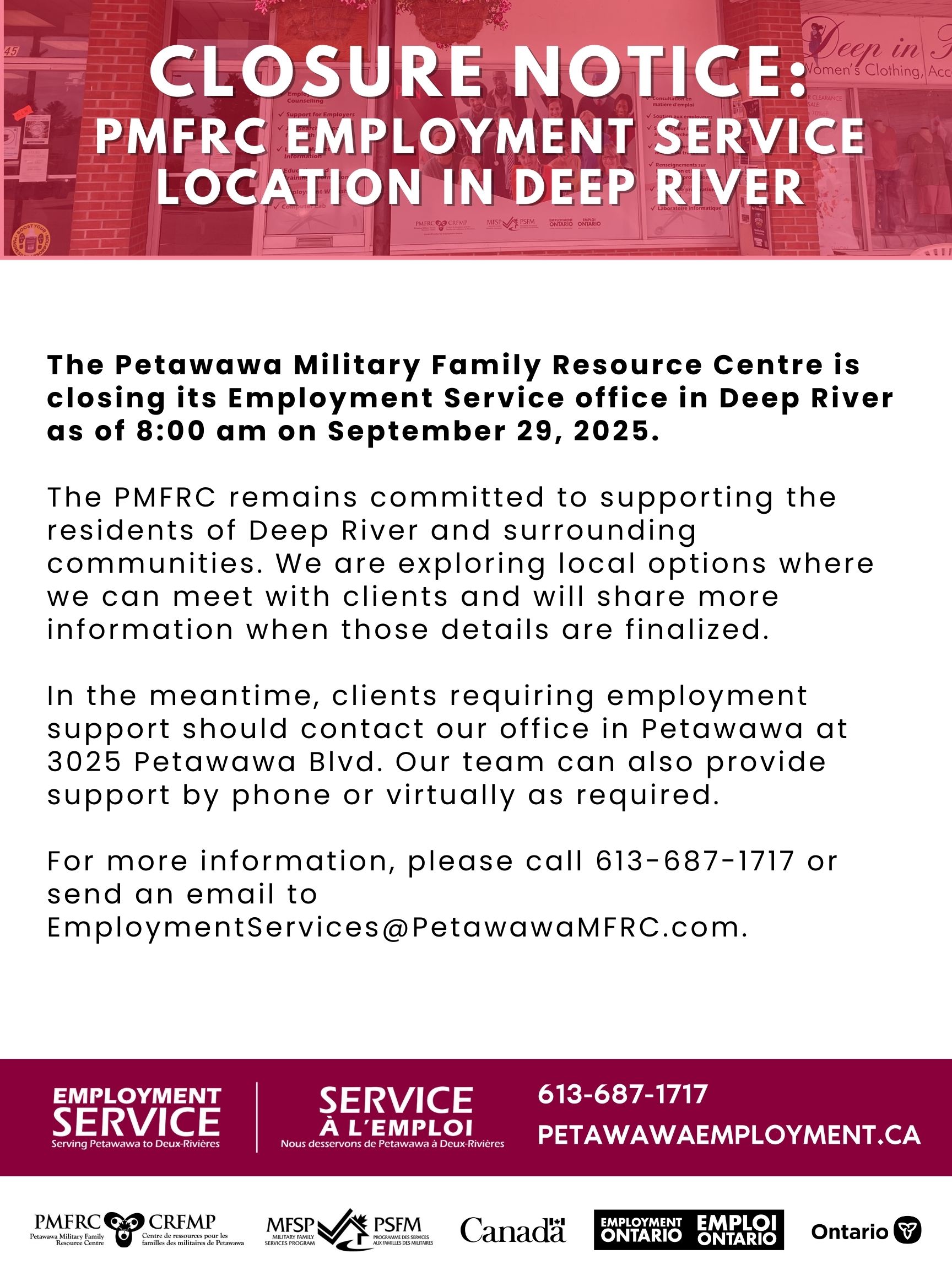 The Petawawa Military Family Resource Centre is closing its Employment Service office in Deep River as of 8:00 am on September 29, 2025.